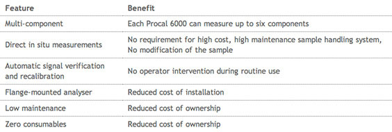 The Procal 6000 analyser operates on the proven single beam, dual–wavelength IR light principle. Mid IR Pulses, at two specific wavelengths per monitored component, are transmitted through the in situ sample cell. The ‘measure’ pulse is partially absorbed by the gaseous components being measured while the ‘reference’ pulse remains unaffected. Up to eight wavelengths are available, sometimes sharing reference wavelengths, allowing up to six gas-phase component concentrations to be monitored simultaneously. Uniquely the operation, zero and calibration are “fully challenged” in that all operating modes use only the same optical path and system components as in normal operation.